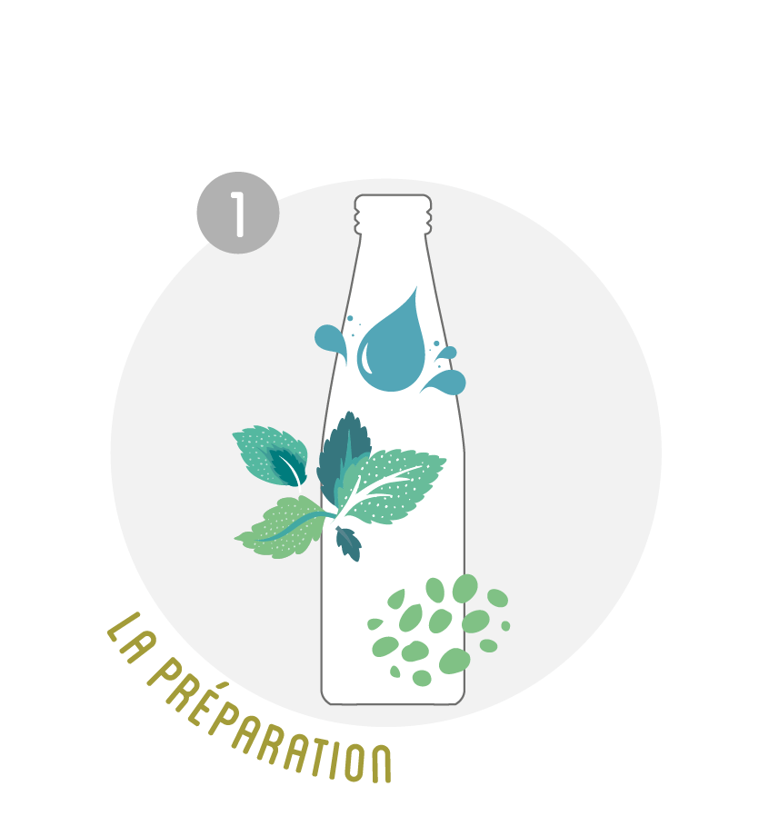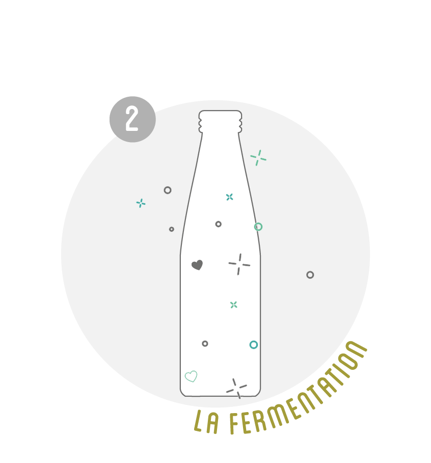 Des grains de kéfir frais, des fruits, fleurs ou plantes et du sucre de canne bio sont mis dans de l’eau filtrée.